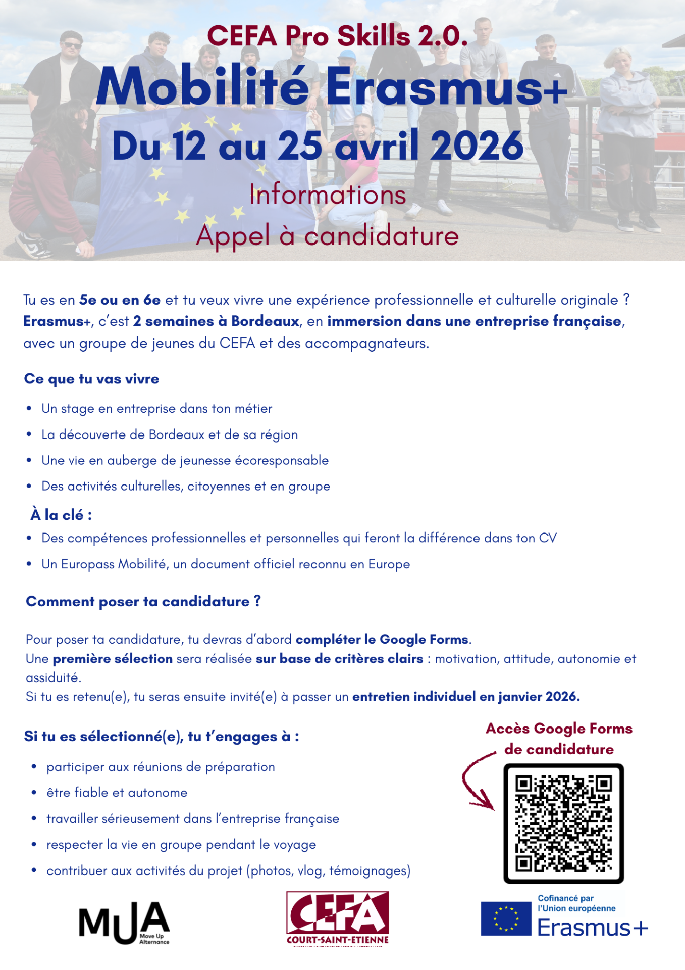 Le CEFA poursuit aujourd'hui cette dynamique en proposant, au mois d'avril 2026, une mobilité Erasmus+ ouverte aux élèves de 5e et 6e, toutes sections confondues. Notre objectif : offrir à nos jeunes une chance unique de développer leurs compétences, de renforcer leur confiance et de s'ouvrir à l'Europe..
